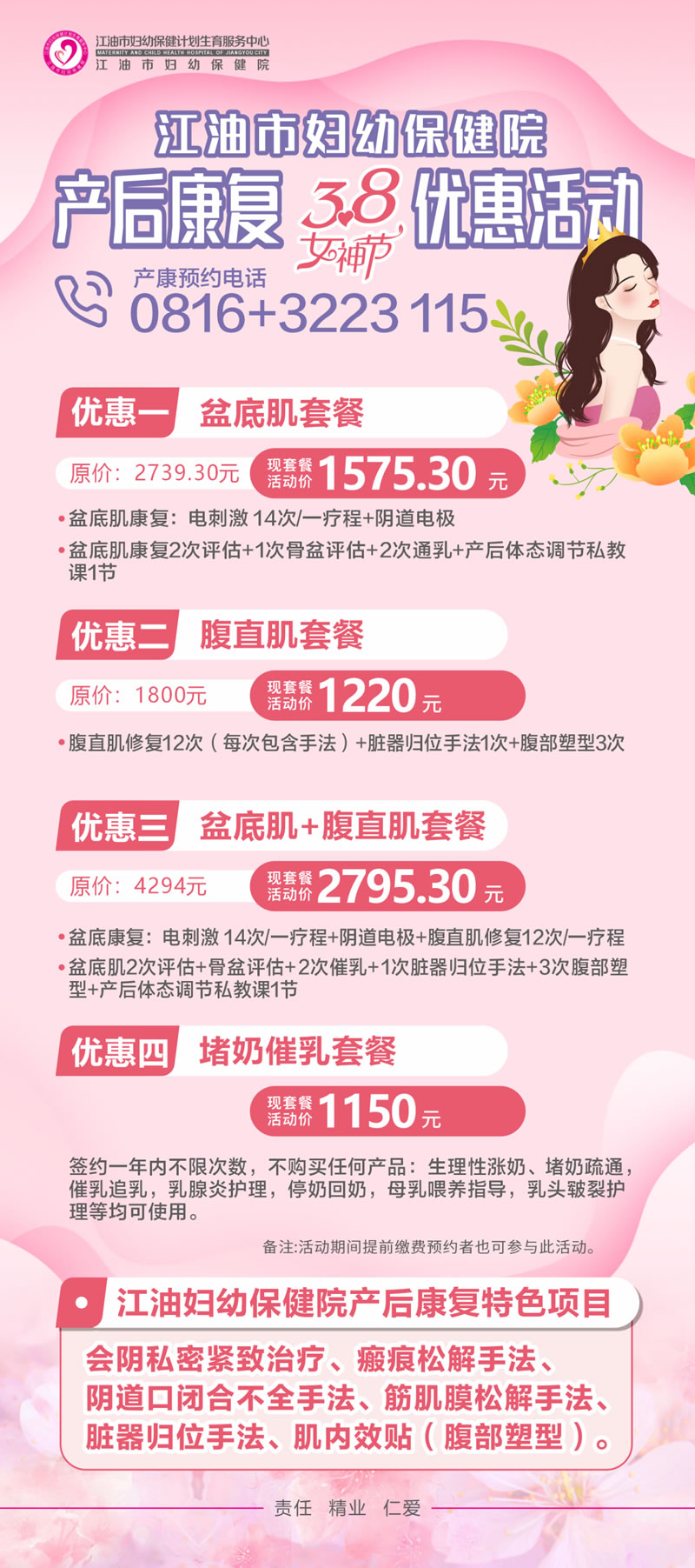 春暖花开 献礼女神 | 产后康复中心女神节优惠活动来啦! 发布时间:2024-03-04 女神节即将来临为呵护女性健康江油市妇幼保健院产后康复中心特为姐妹们送上一份专属健康福利愿每位女性在人生每个阶段都能活出自己的美丽