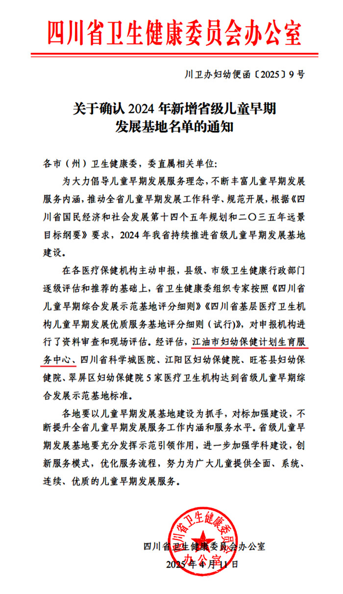 家有萌娃的家长们注意啦!一大波好消息来袭!近日,四川省卫生健康委员会办公室发布《关于确认2024年新增省级儿童早期发展基地名单的通知》(川卫办妇幼便函〔2025〕9号),江油市妇幼保健院凭借卓越实力,成功创建为省级儿童早期发展基地!这标志着我市儿童早期发展服务正式迈入省级标准化、专业化新阶段,为孩子们的健康成长再添硬核保障!