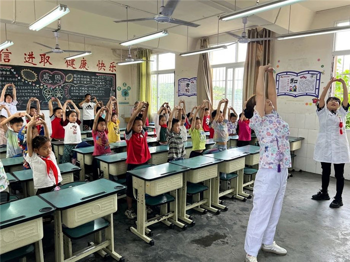 随后,中医团队带领学生们练习专为儿童改编的“趣味八段锦”。伴随着轻快的音乐,孩子们模仿医生“双手托天理三焦”“摇头摆尾去心火”等动作,在舒展筋骨的同时感受传统养生功法的魅力。“像在跳舞,又像做游戏!做完感觉身体暖暖的。”一年级学生张同学兴奋地说。