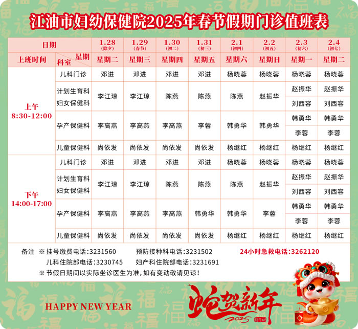 【值班通知】医院的年味,节日的坚守!江油市妇幼保健院2025年春节假期门诊值守安排转需~