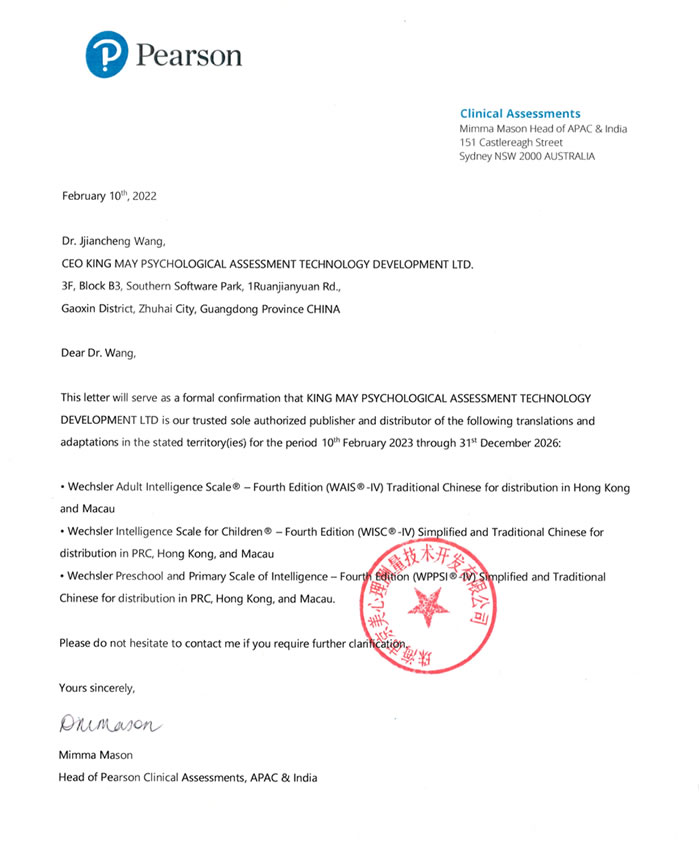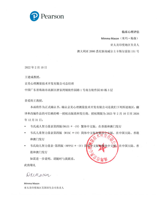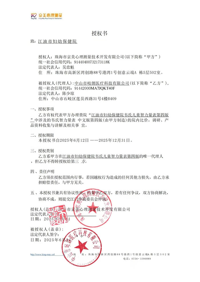 附件:《韦氏智力量表第四版儿童版系统唯一代理商》授权书。
